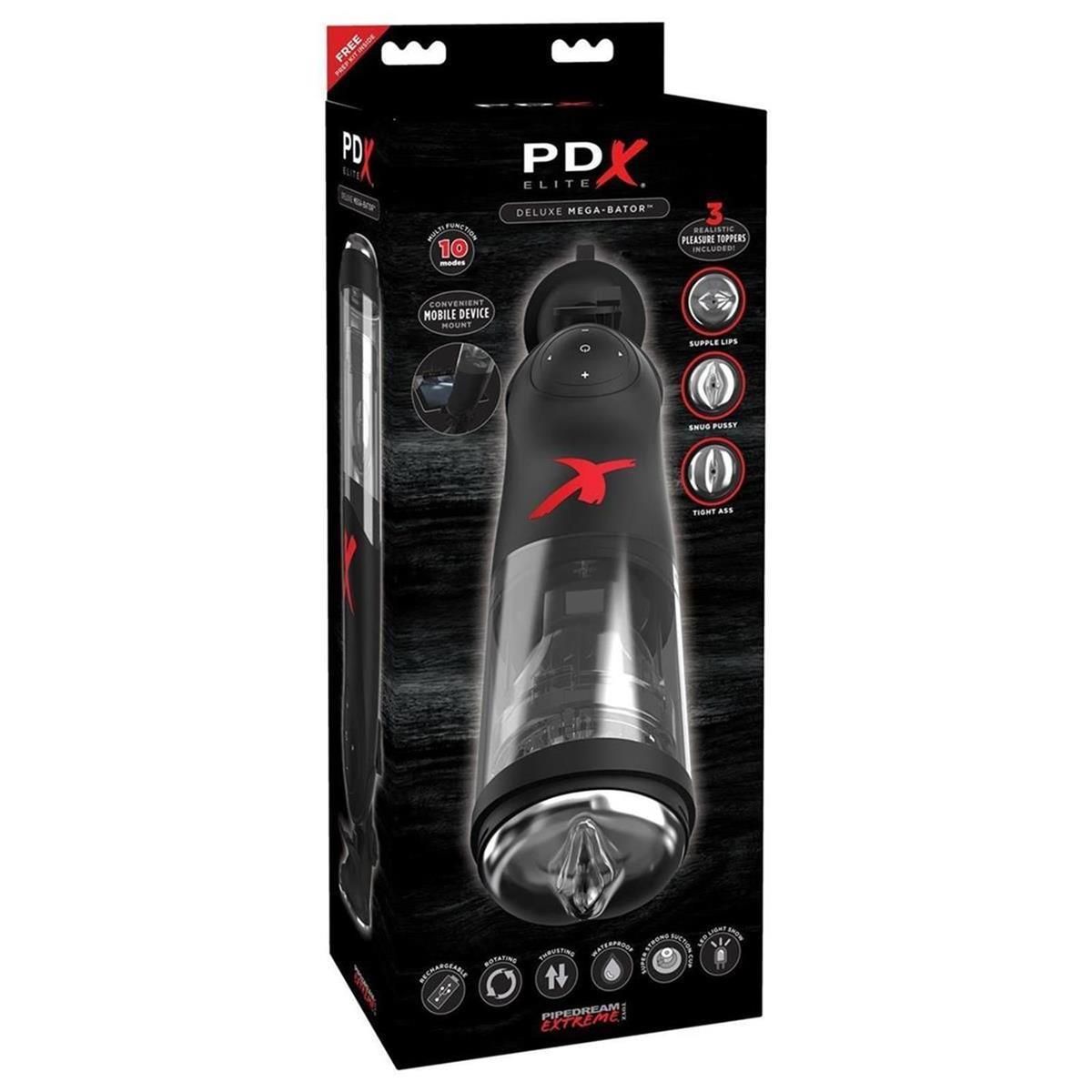 Dieser Masturbator ist individuell anpassbar mit seinen 3 verschiedenen Lust-Öffnungen – entweder eine besonders realistische Vagina, ein praller Kussmund oder ein enger Anus, hier ist alles dabei. Die 10 Rotations- und Stoßmodi werden dann in süße Ekstase erheben und wenn es schneller gehen soll, können die 5 Geschwindigkeiten separat gesteuert werden. Mit dem Saugfuß wird das gute Stück an einer glatten Oberfläche befestig für eine handfreie Nutzung. Das geht sogar unter der Dusche, da der Deluxe Mega-Bator wasserdicht ist. Ein besonderes Highlight ist auch die Mobilgerätehalterung, mit der Tablet oder Smartphone gehalten werden können. Inklusive USB-Ladekabel und 3 Penisringe.