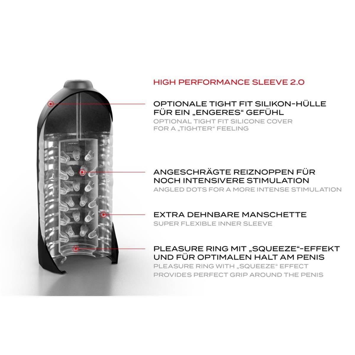 Auch die Sleeve wurde für den Suck-O-Mat 2.0 weiter optimiert: Sie verfügt nun im Inneren über stimulierende Noppen und kann mit der beiliegenden Tight Fit Manschette kombiniert werden, um den Penis noch stärker zu umfassen und die Stimulation so zu intensivieren.